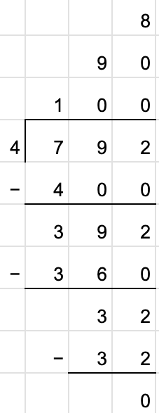 With some understanding, you have a grasp of what the long division algorithm is really doing. We break down the number we are dividing (792) into chunks. Then we divide each of those chunks by the number we are dividing by (4).