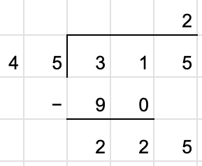 At this level, we can use our basic idea of chunks to make progress toward computing 315 ÷ 45. For example, we can take a chunk of 90 out of 315 as a first step, since 90 is a simple multiple of 45: