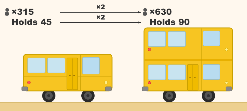 315 ÷ 45 is a little hard to think about with mental math, but those 5s will turn into 0s if we double both terms. And doubling both terms in a division problem will not affect the answer! It would be like having twice as many students but also having double-decker buses.