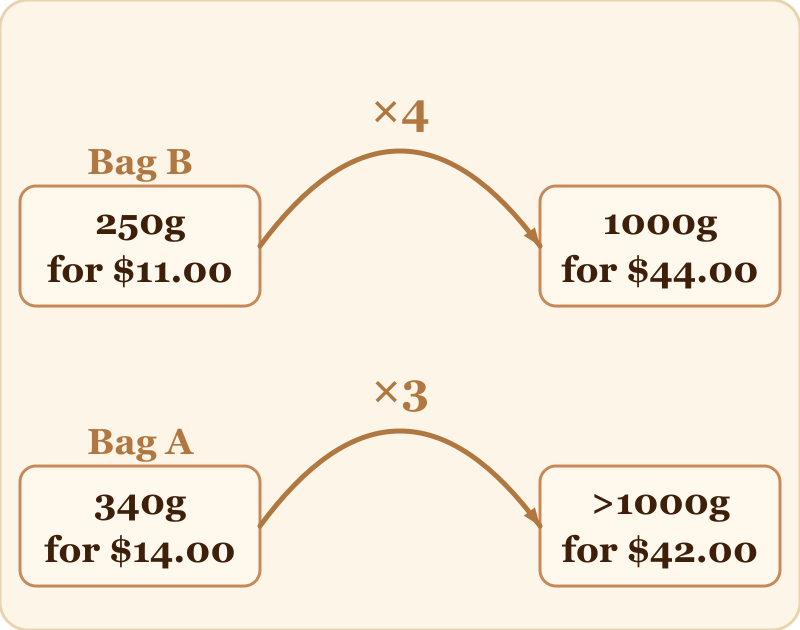 It’s hard to compare the bags immediately because they are different sizes. But we can use our imagination, and some math, to make them more comparable. Why don’t we scale both of the bags up to a convenient larger bag—say, about 1000g?