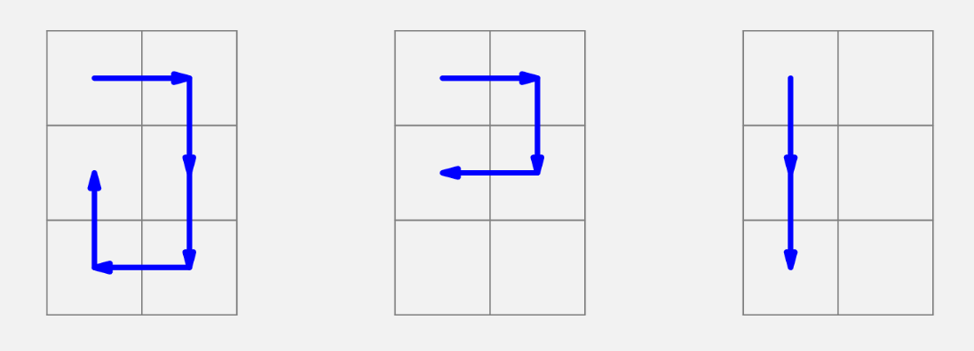 We can find all three of those by hand without too much trouble. But we might wonder more generally: for a grid with r rows and c columns, how many possible journeys are there?